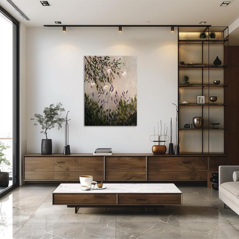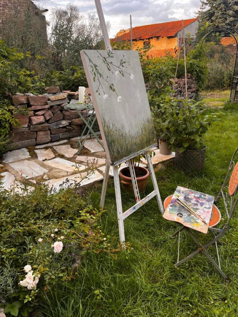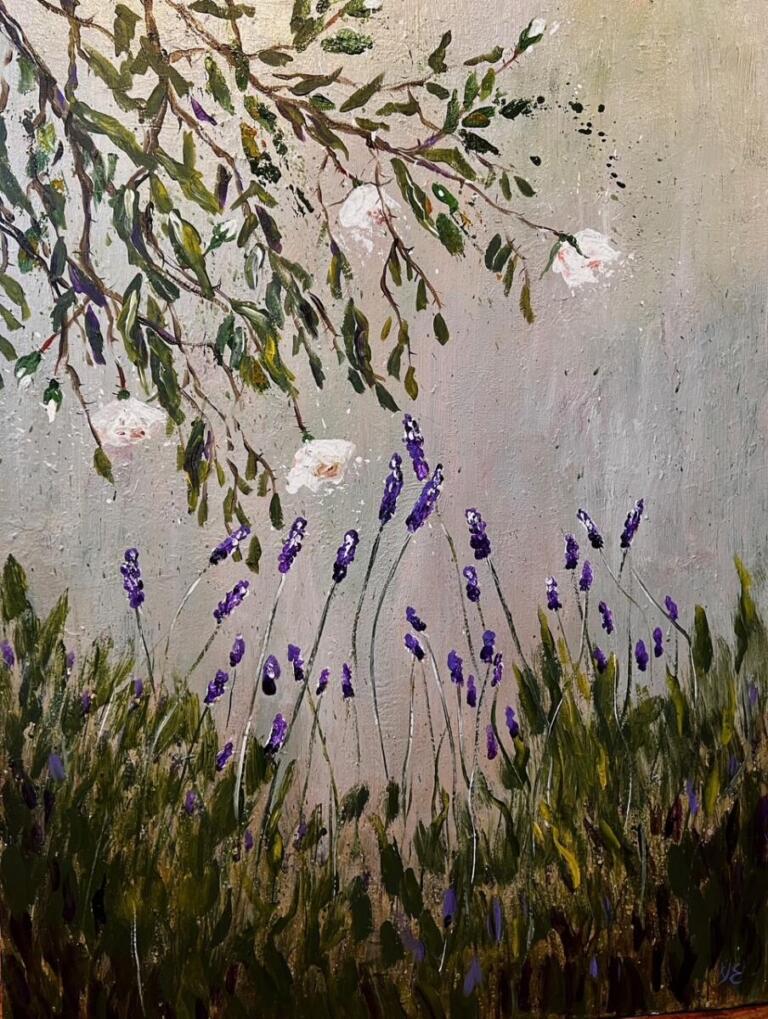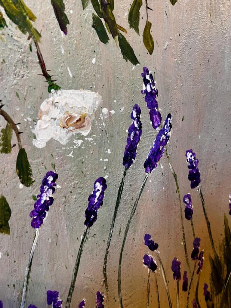Rosen und Lavendel. Acryl, Öl auf Leinwand, versiegelt.